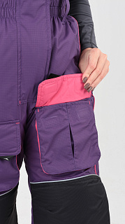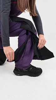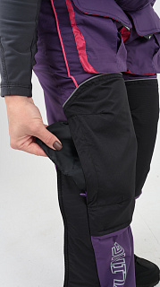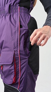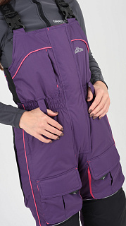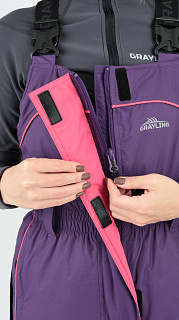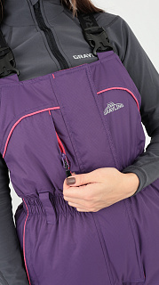 Брюки костюма имеют регулируемые лямки, что обеспечивает комфортабельную посадку и свободу движений. Низ брюк утягивается резинками, что предотвращает их задирание и обеспечивает дополнительную защиту от холодного воздуха и снега.